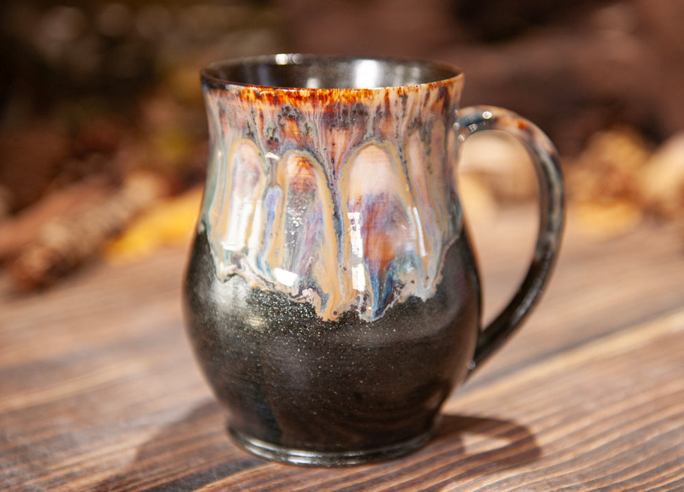 This mug holds approximately 18 oz when filled up completely to the rim.