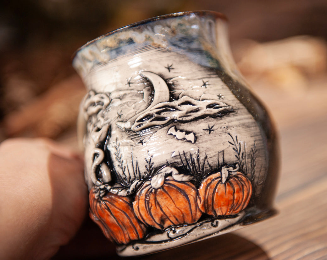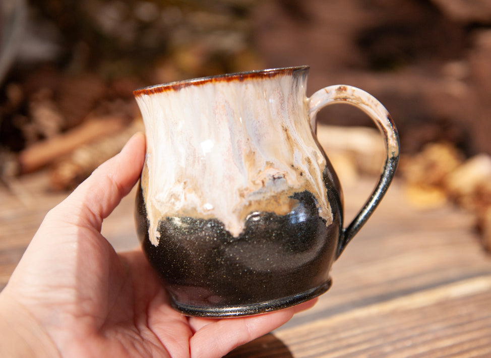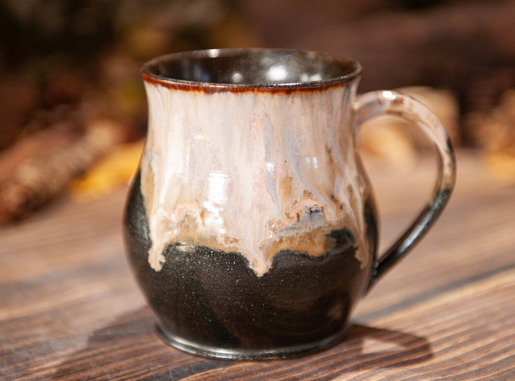 This mug holds approximately 18 oz when filled up completely to the rim.