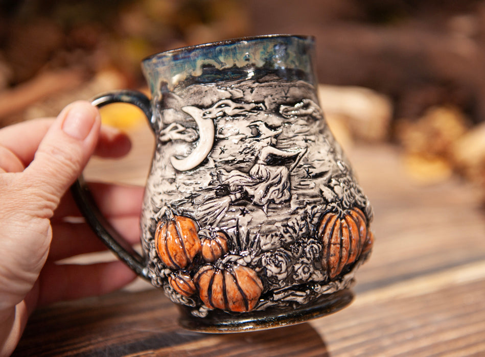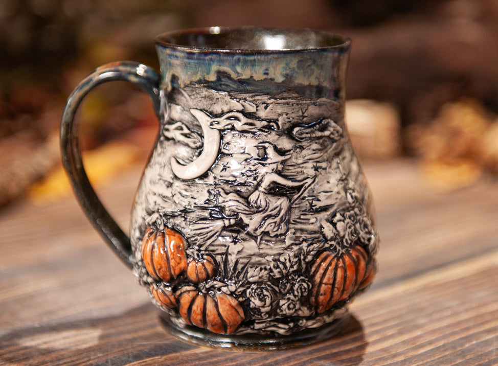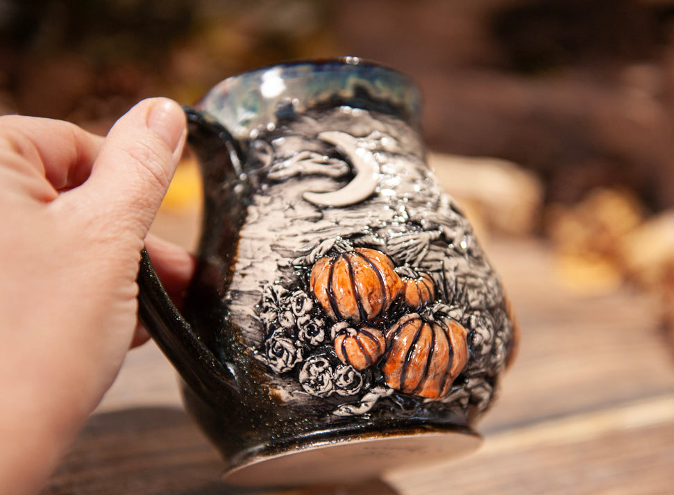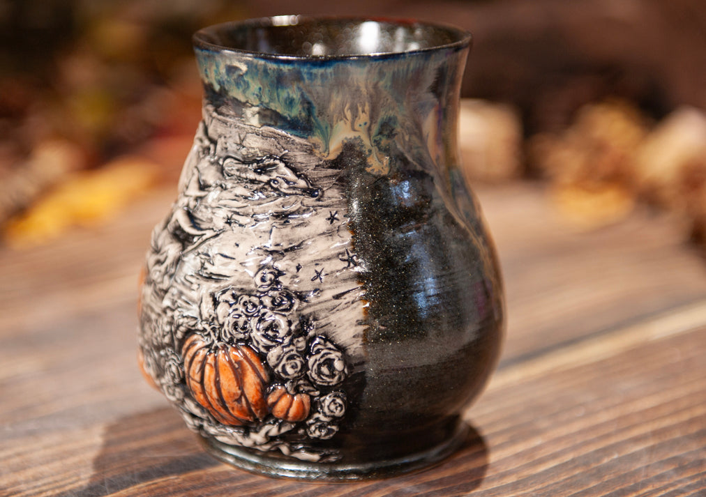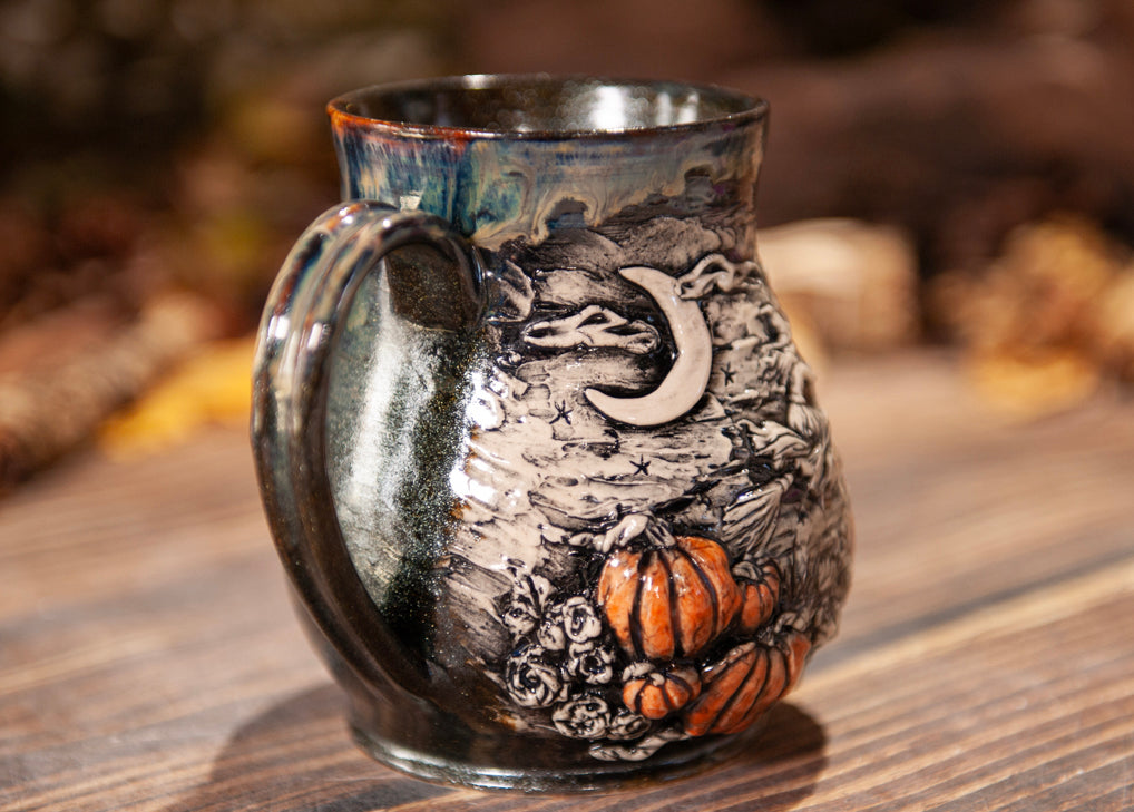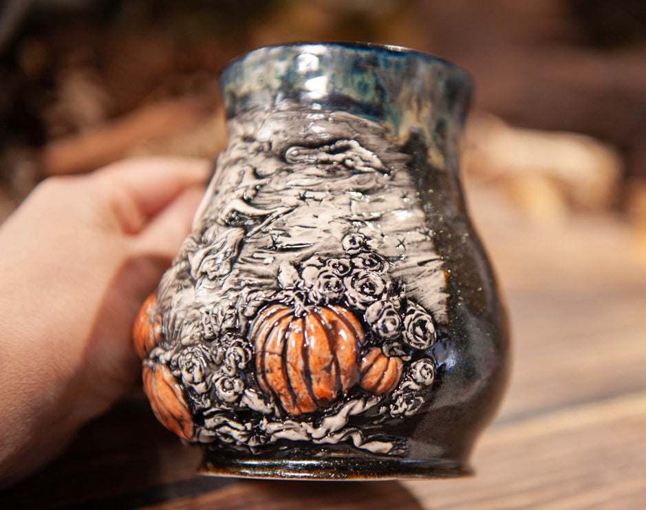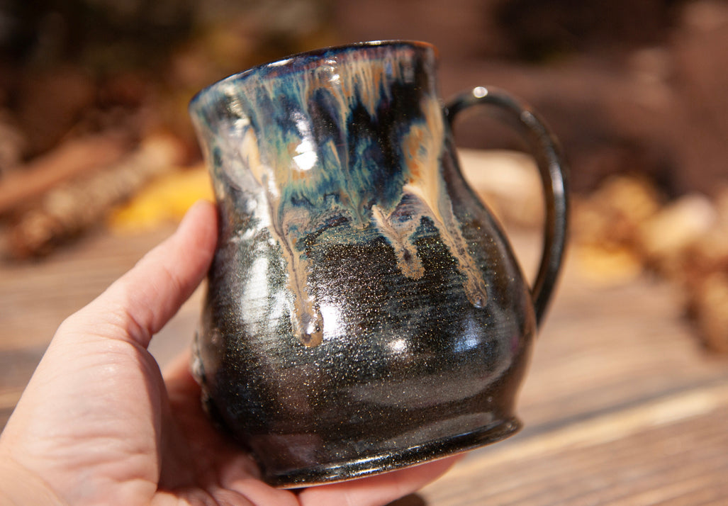 This mug holds approximately 20 oz when filled up completely to the rim.