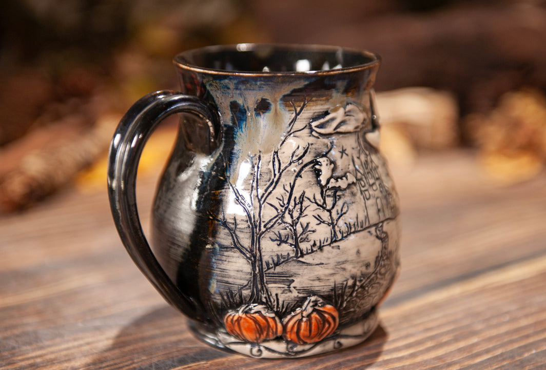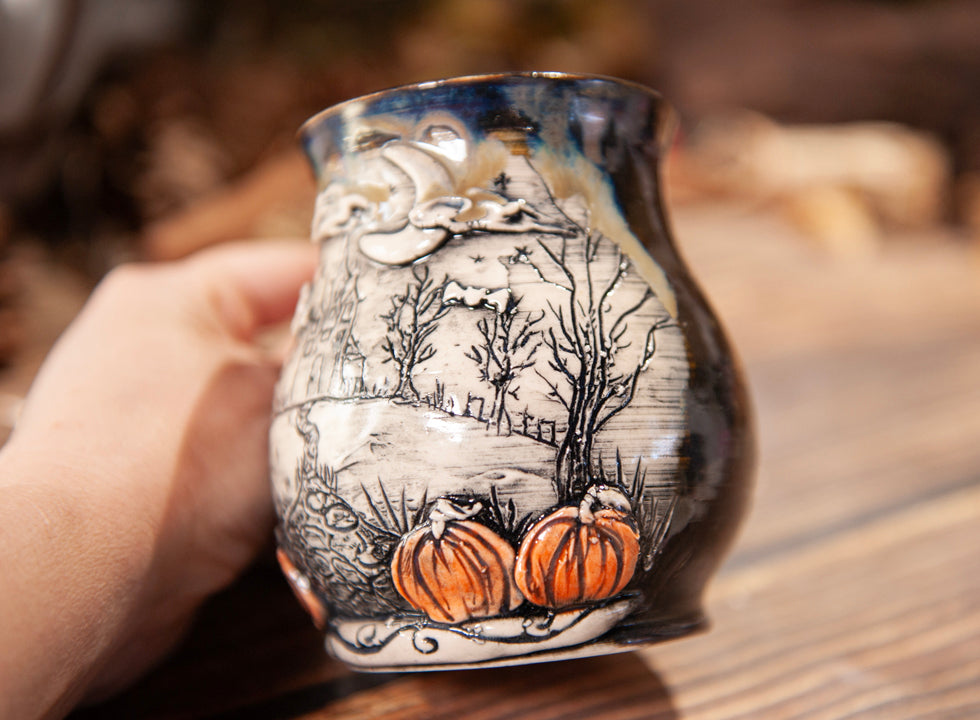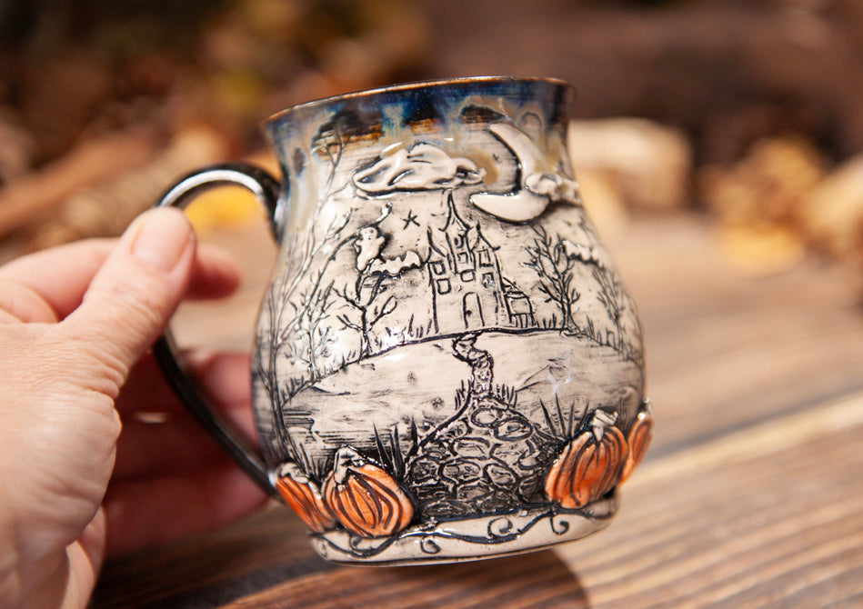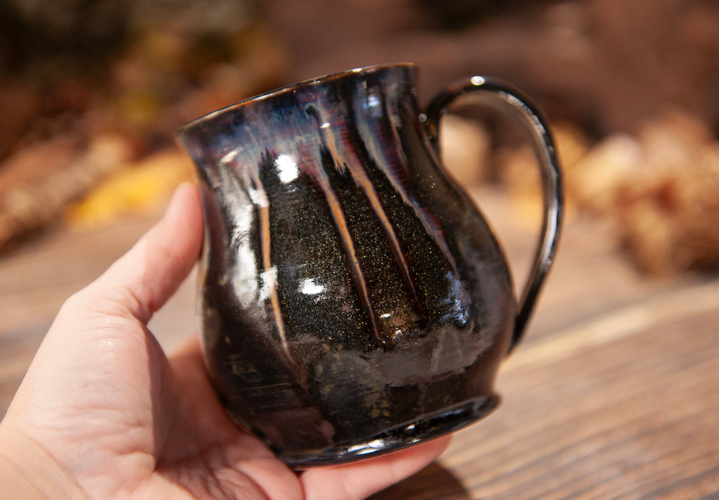 This mug holds approximately 17 oz when filled up completely to the rim.