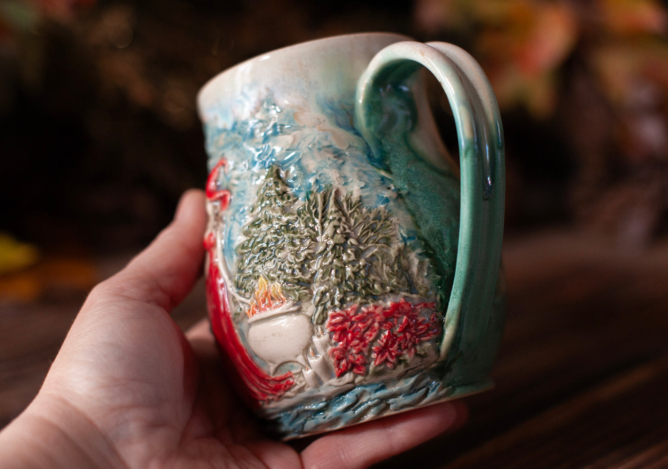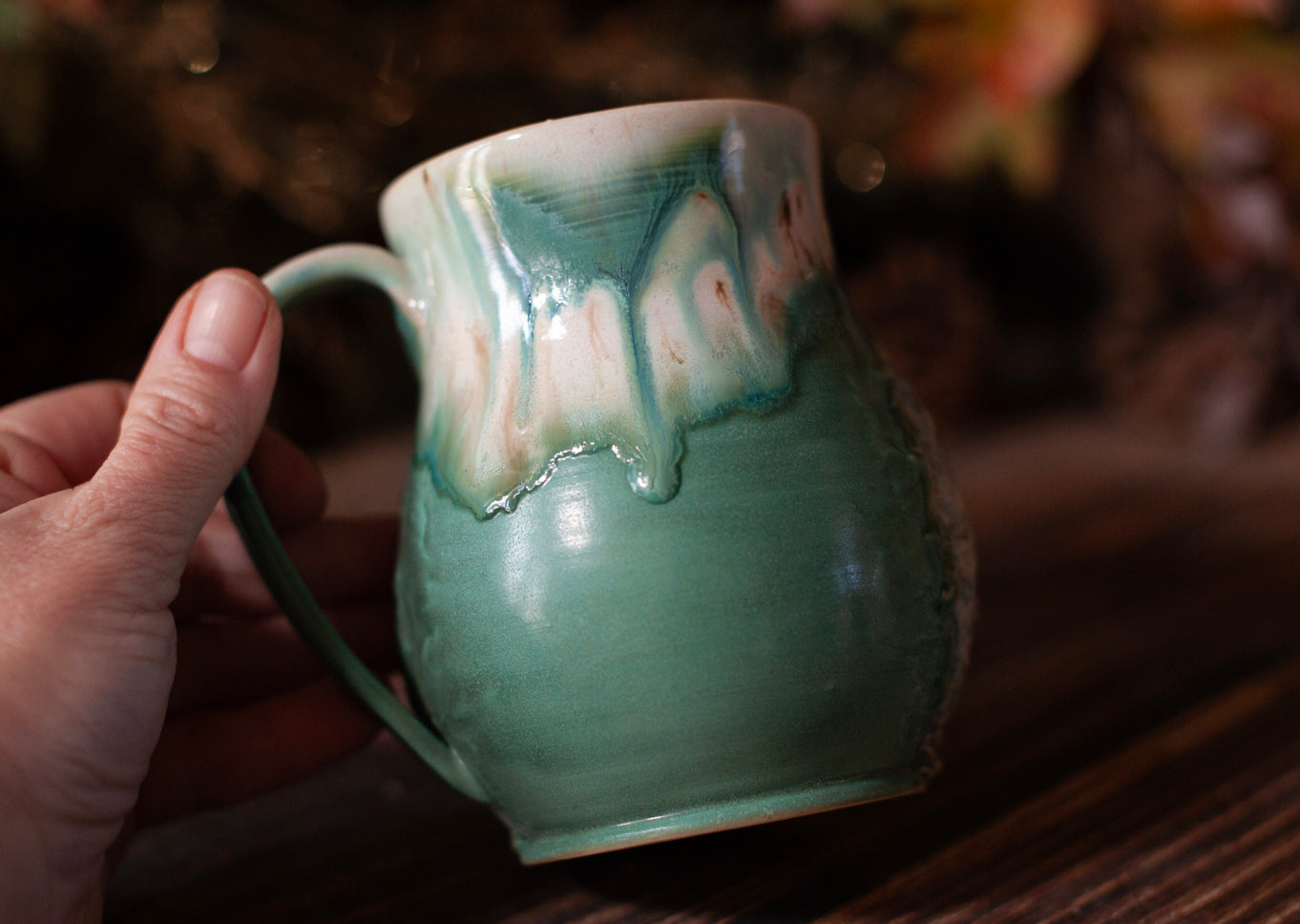 This mug holds approximately 16 oz when filled up completely to the rim.