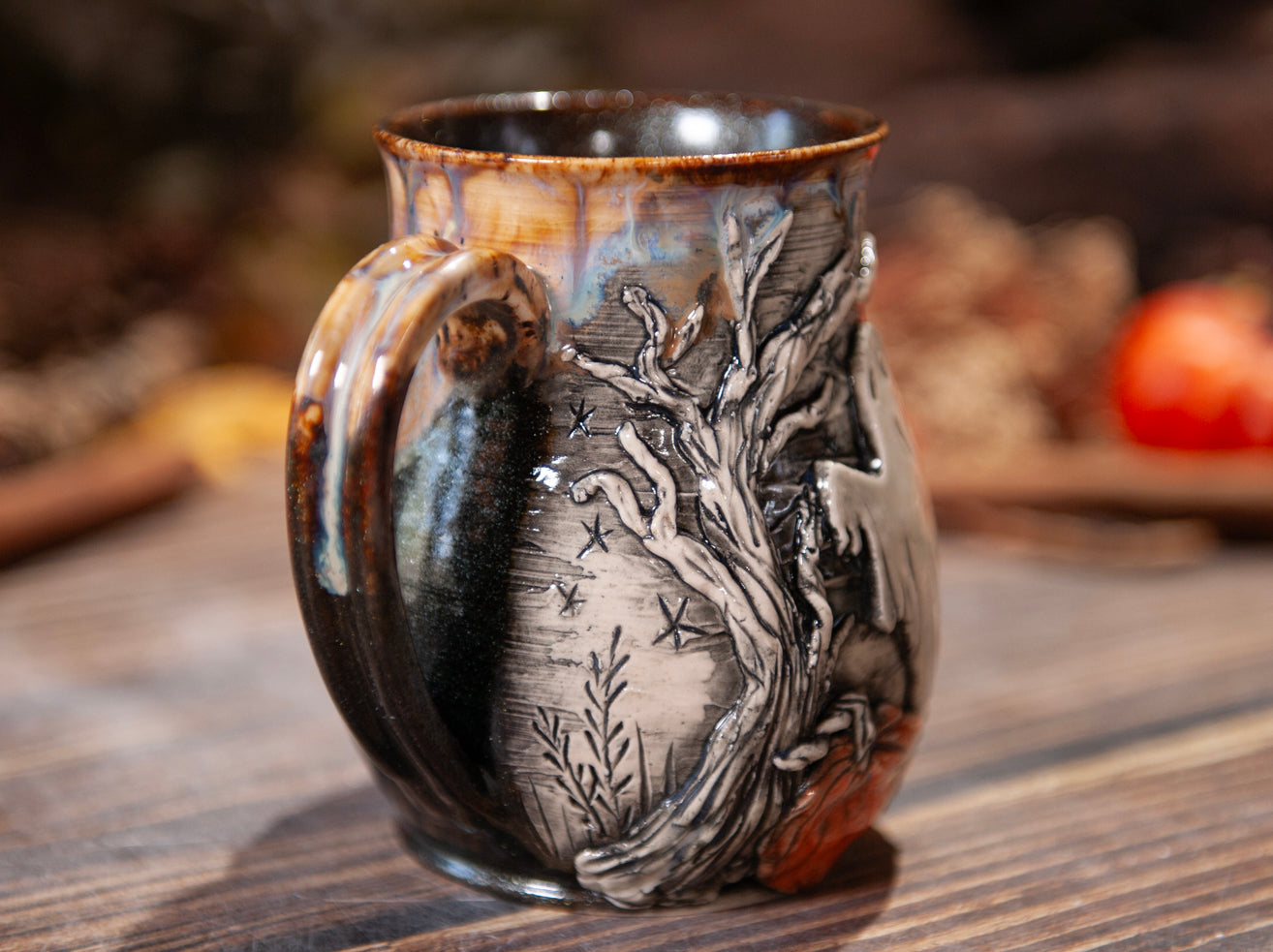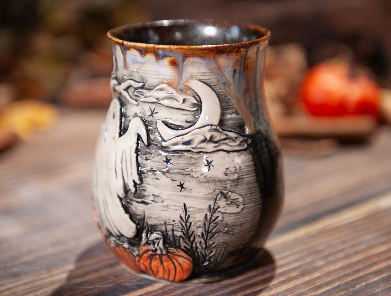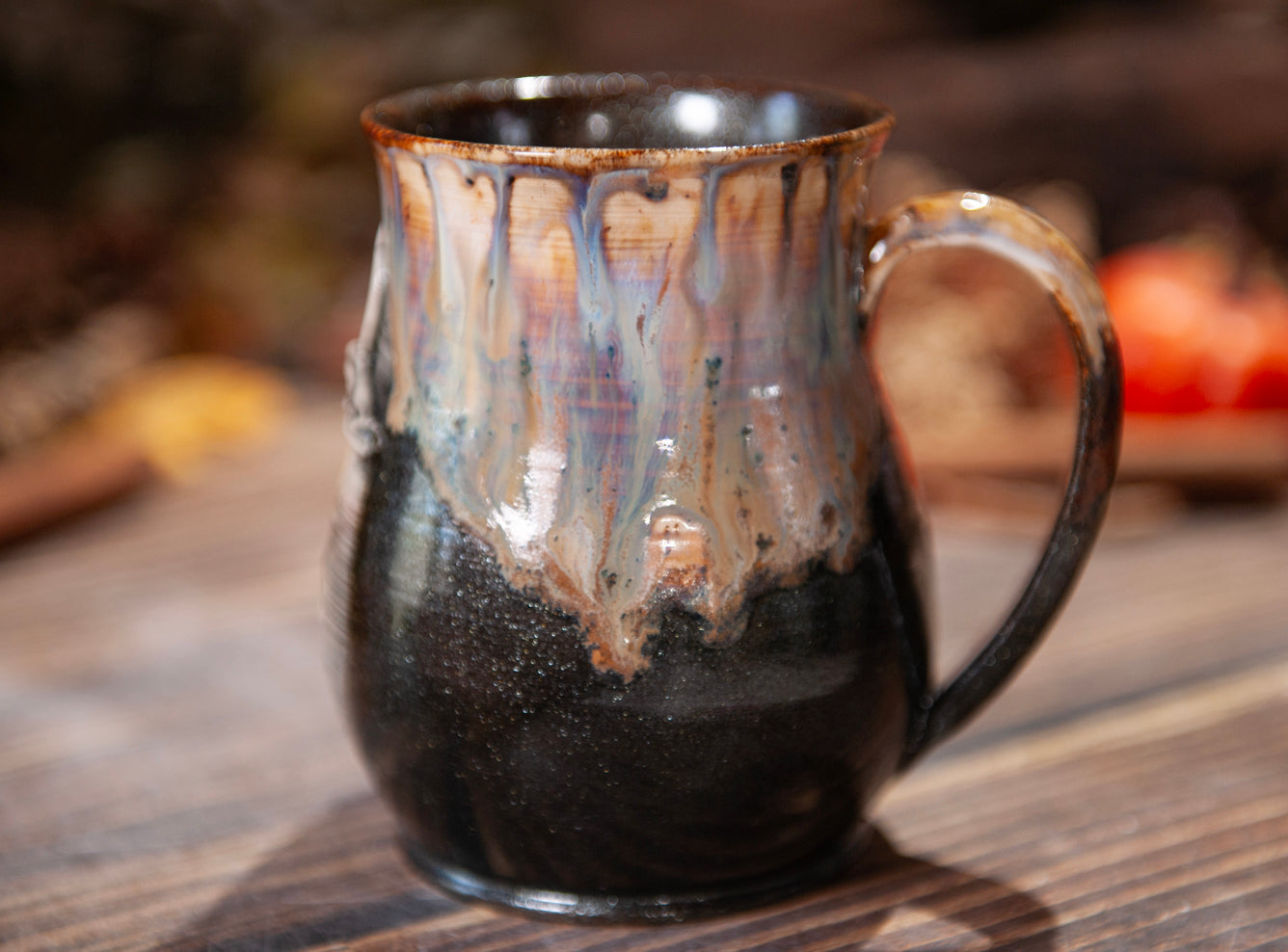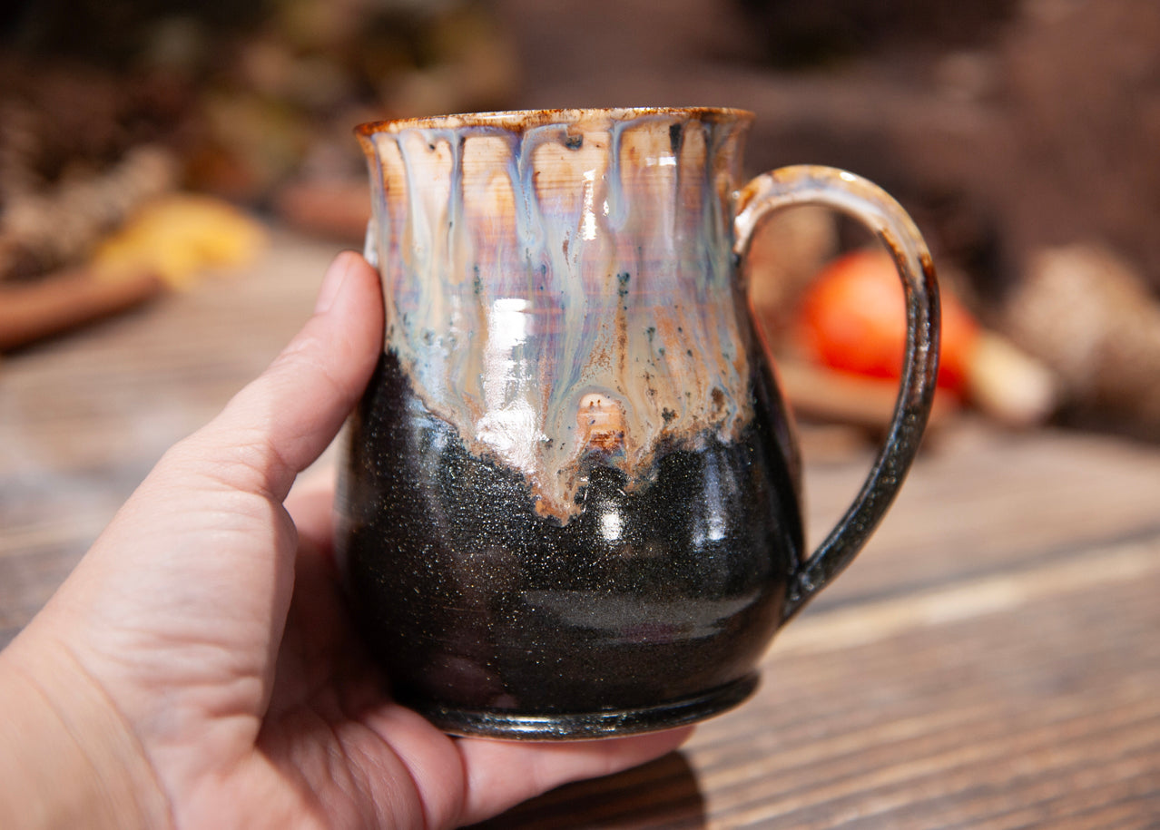 This mug holds approximately 18 oz when filled up completely to the rim.