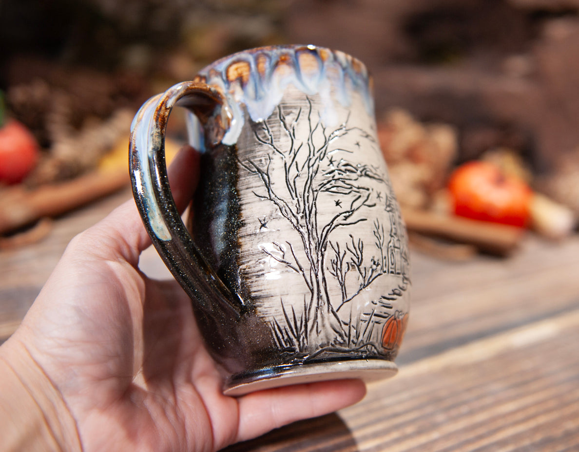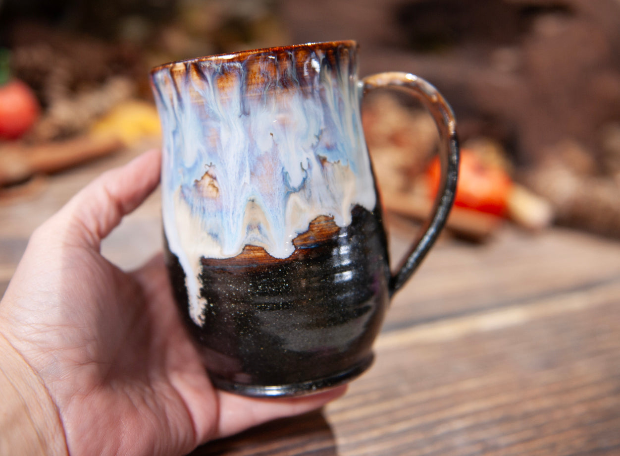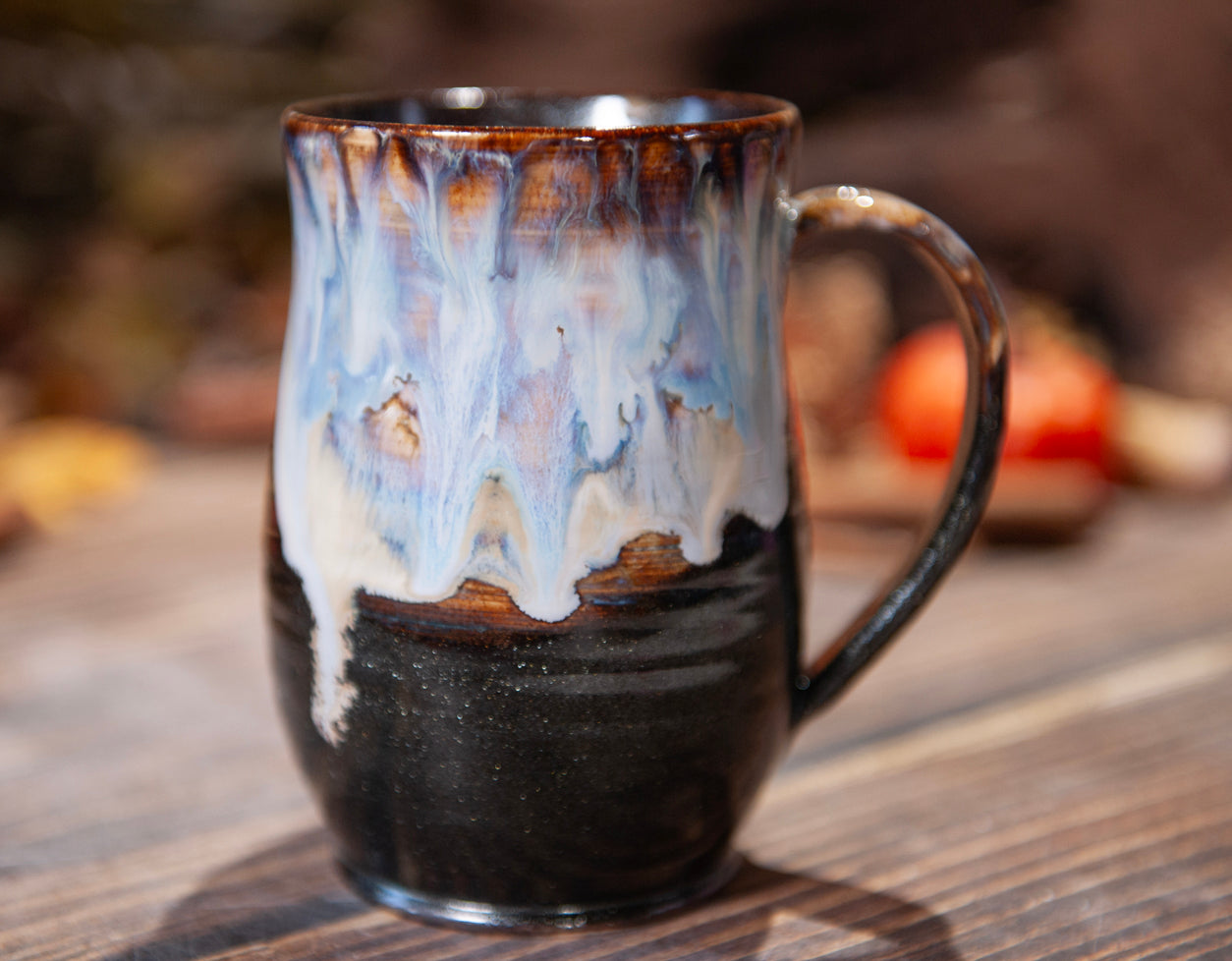 This mug holds approximately 18 oz when filled up completely to the rim.