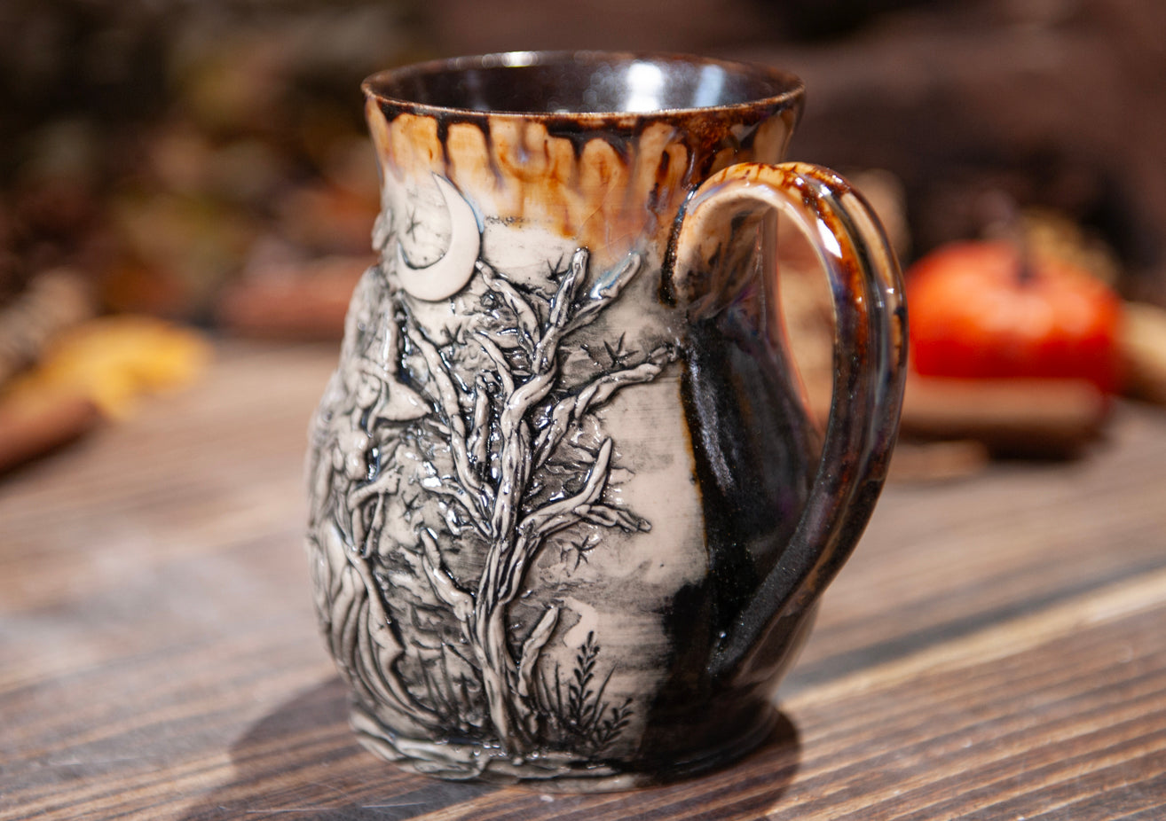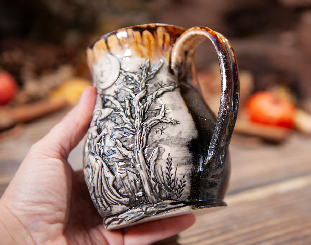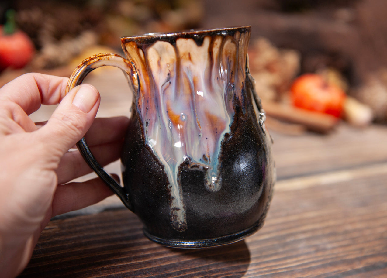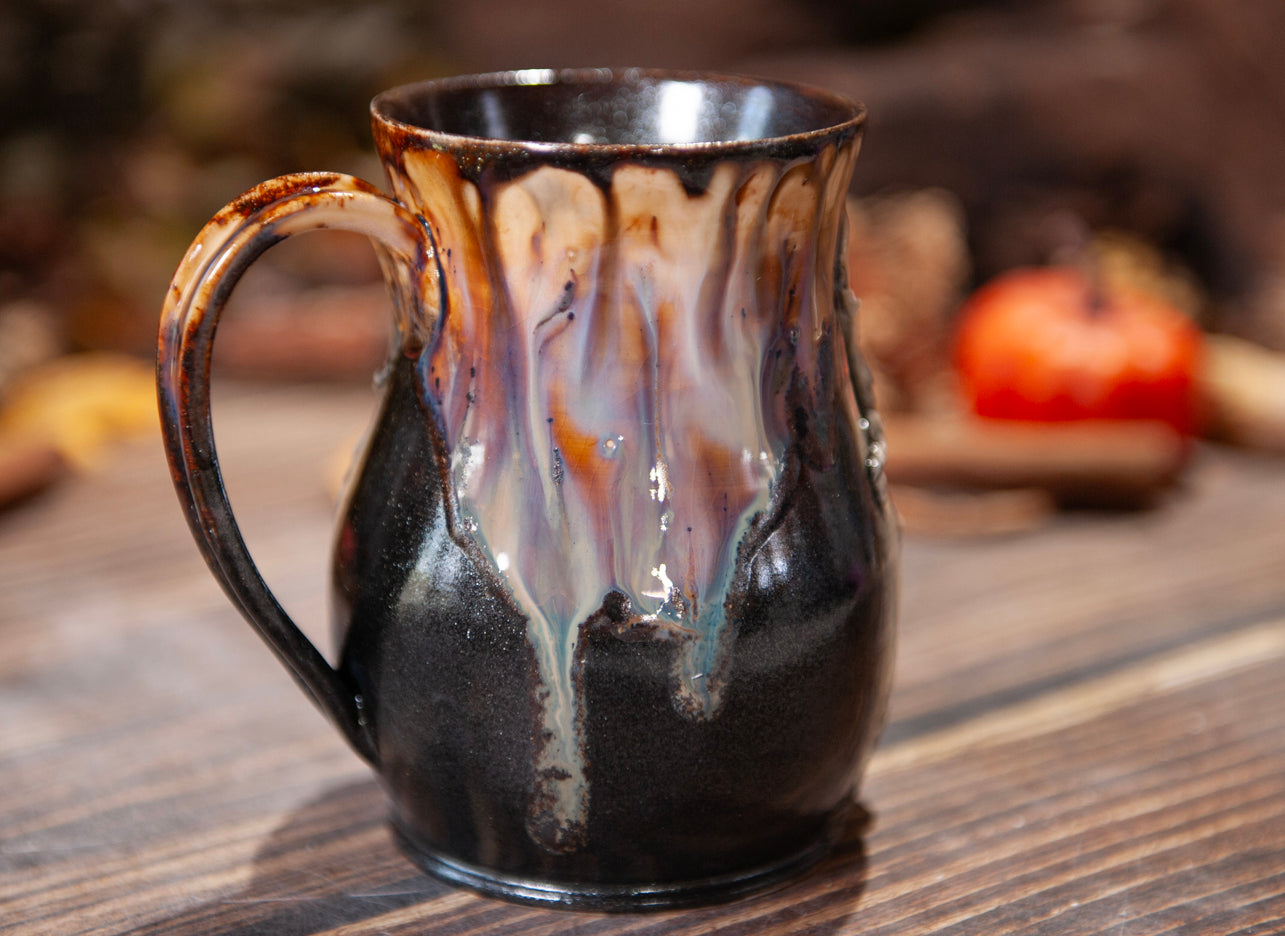This mug holds approximately 17 oz when filled up completely to the rim.