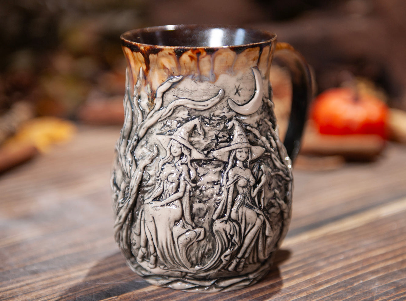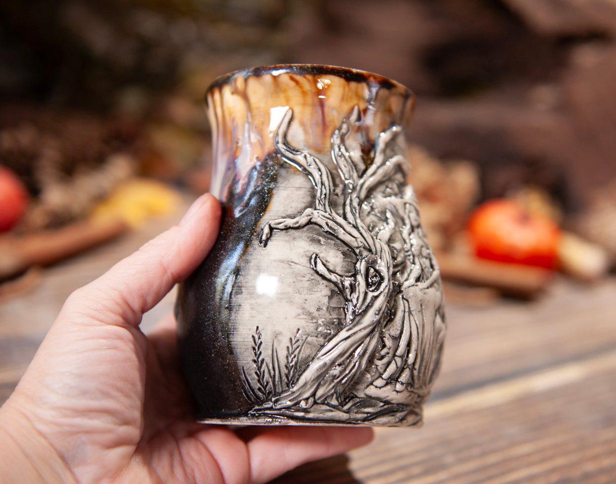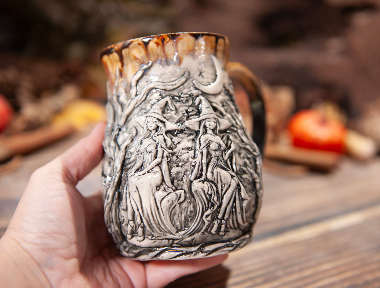 This mug holds approximately 17 oz when filled up completely to the rim.