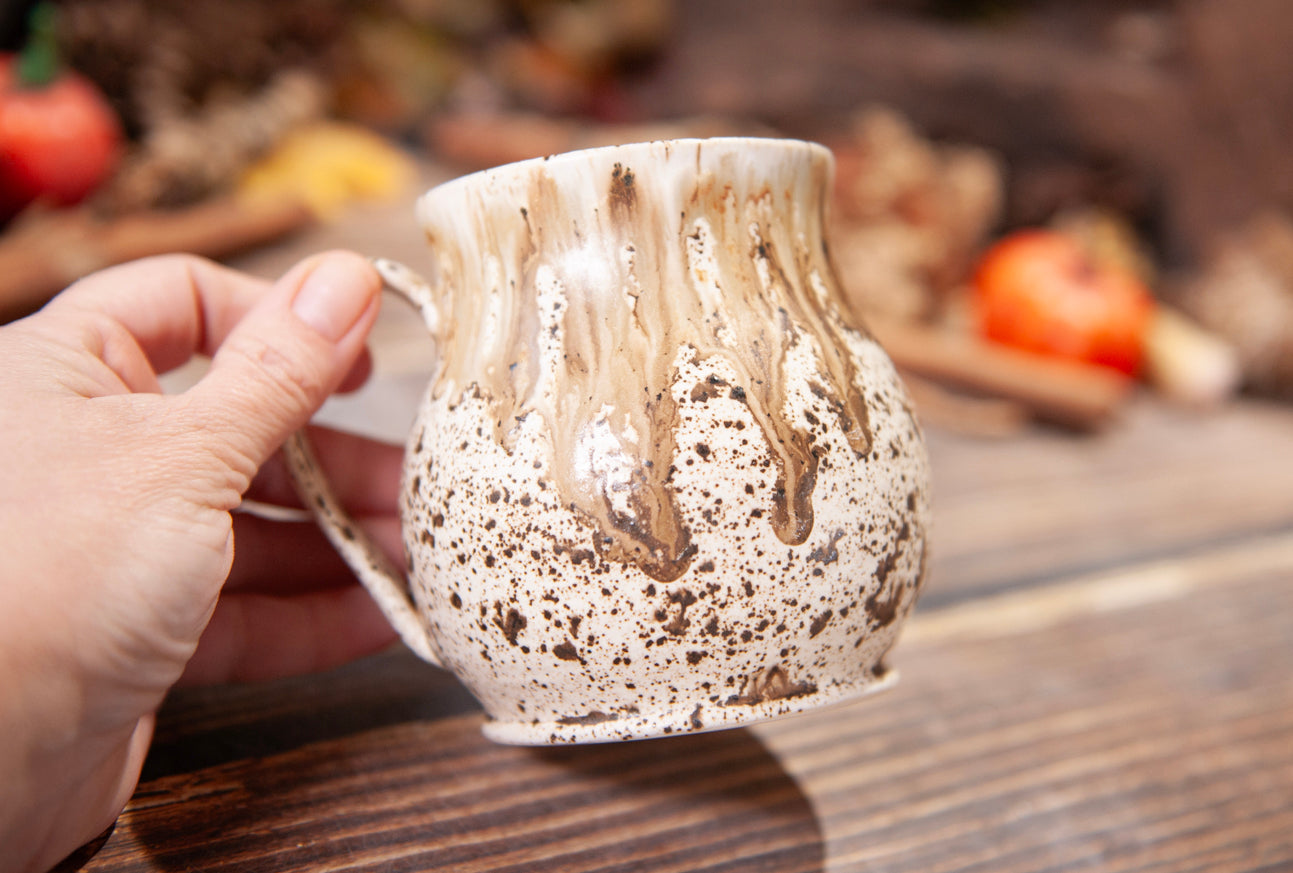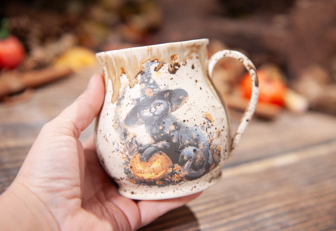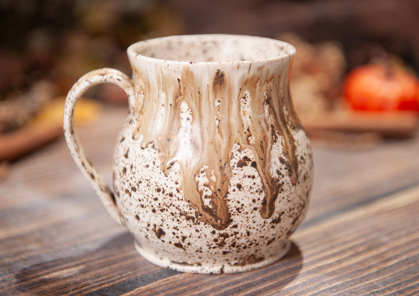 This mug holds approximately 16 oz when filled up completely to the rim.