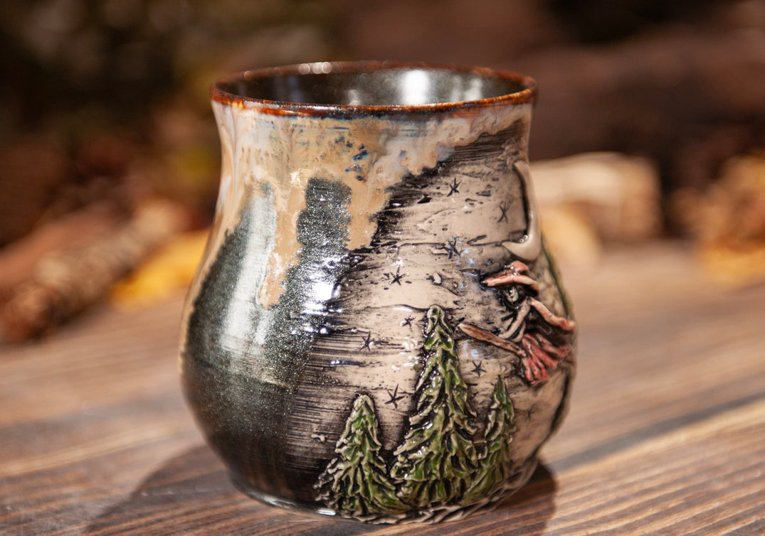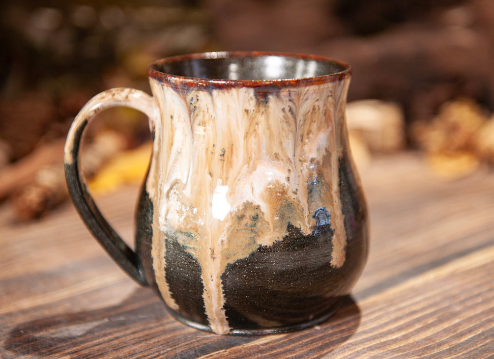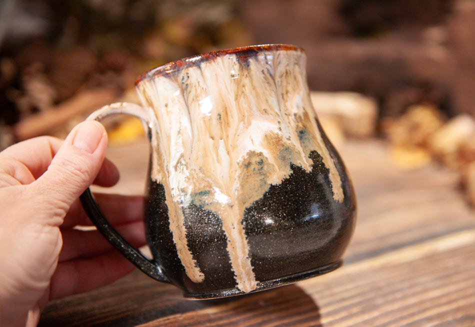This mug holds approximately 22 oz when filled up completely to the rim.