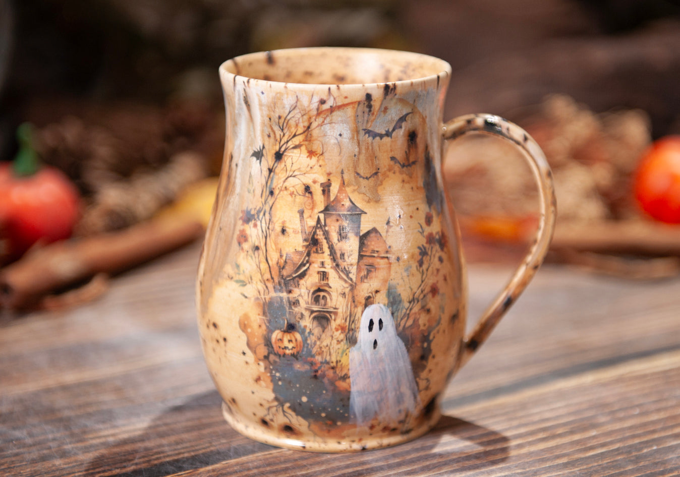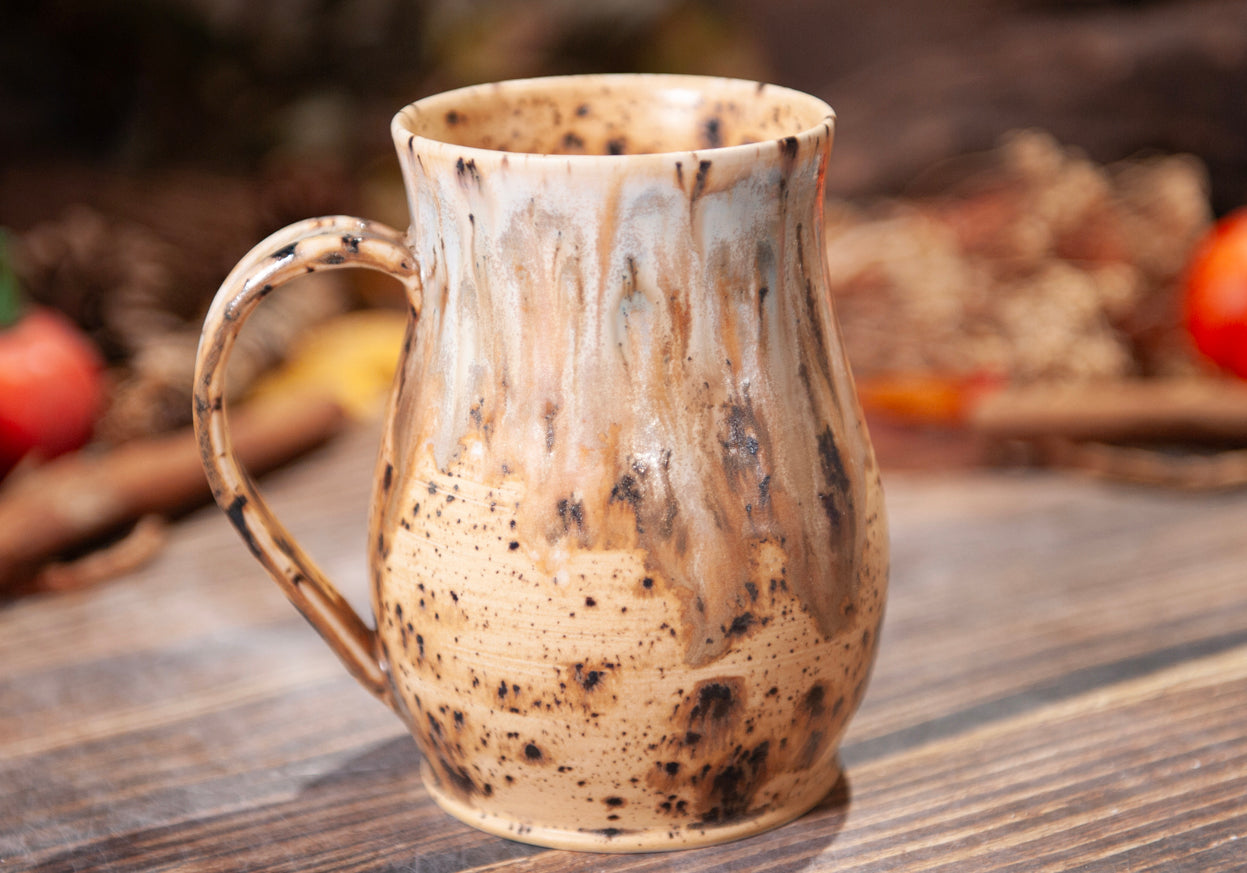 This mug holds approximately 18 oz when filled up completely to the rim.