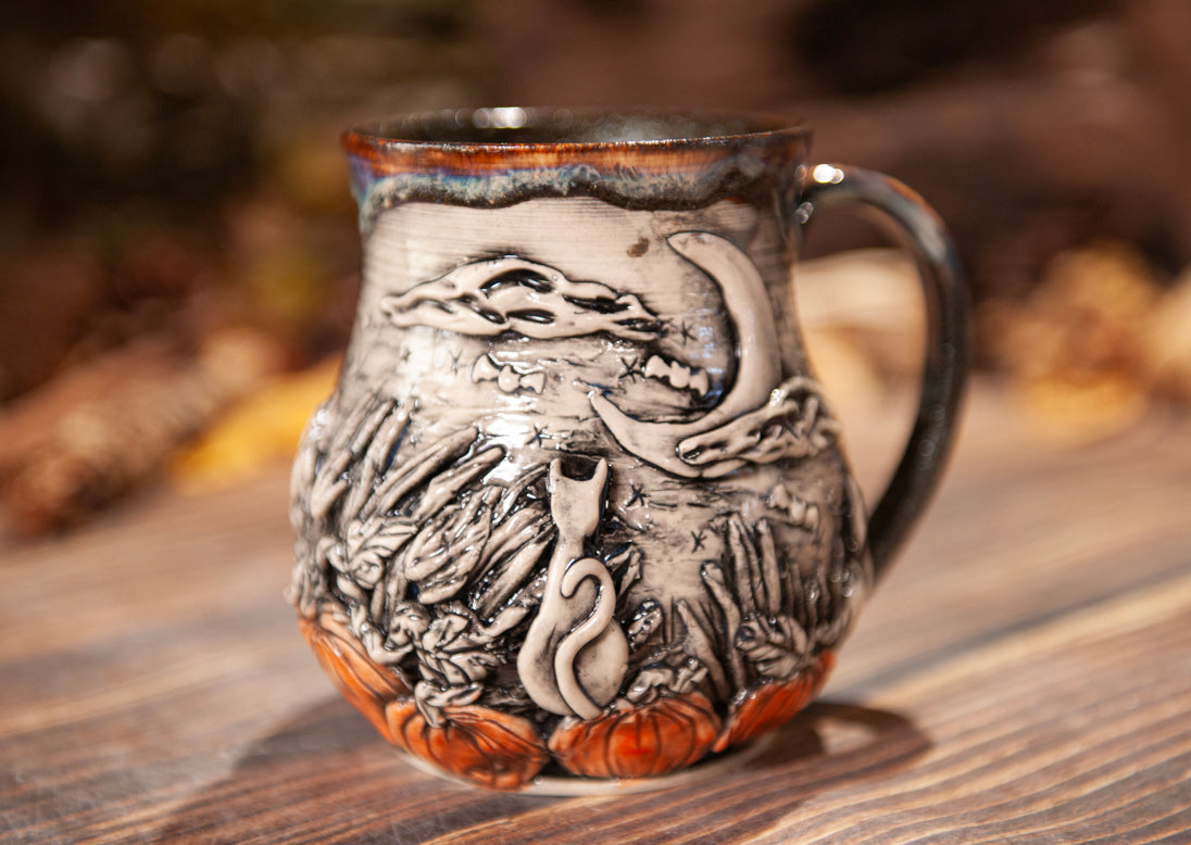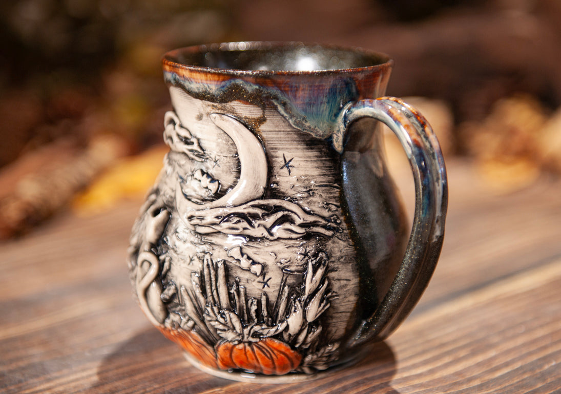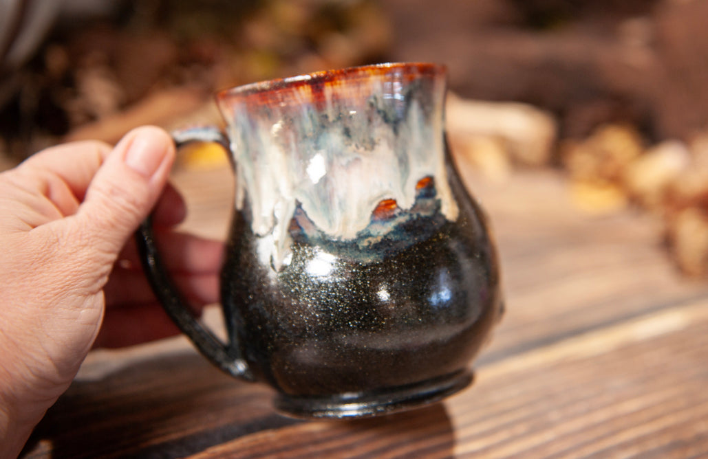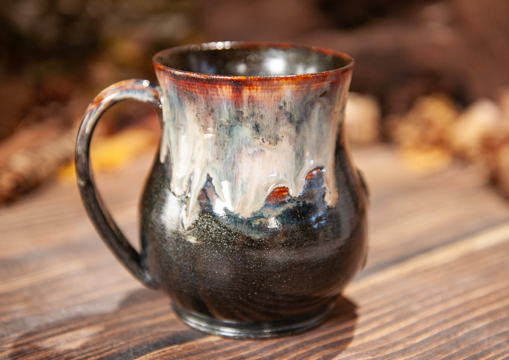 This mug holds approximately 20 oz when filled up completely to the rim.